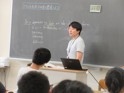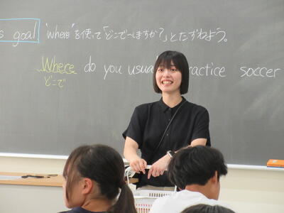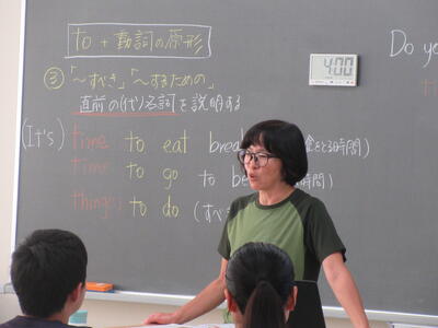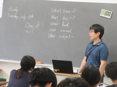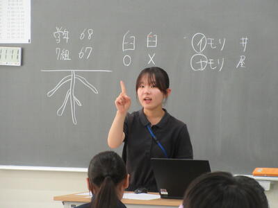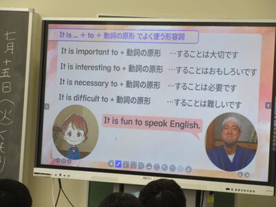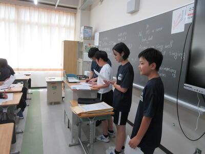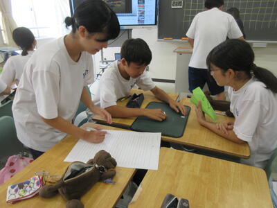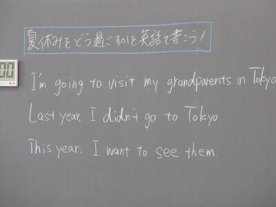 ▼2年生の英語の授業。夏休みまで一週と迫る中、自分の予定を英語で表現しようと取り組む子ども達の姿が広がります。