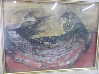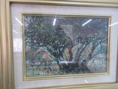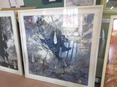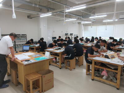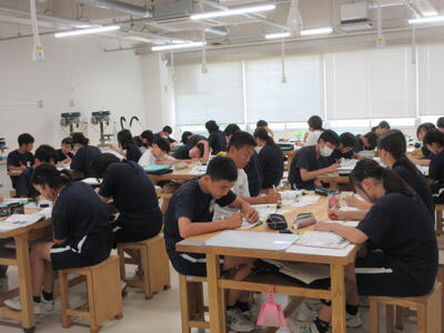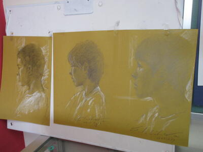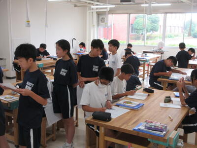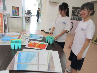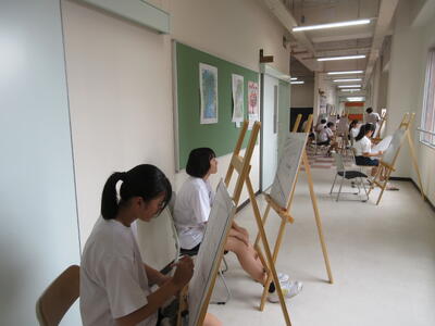 ▼F棟2階の美術室前の廊下では、3年生の子ども達が校舎の風景を描いていきます。みんな、だんだん上手になっていくのがよくわかります。