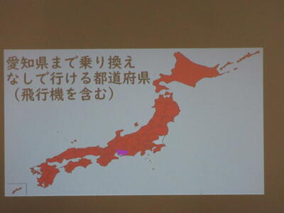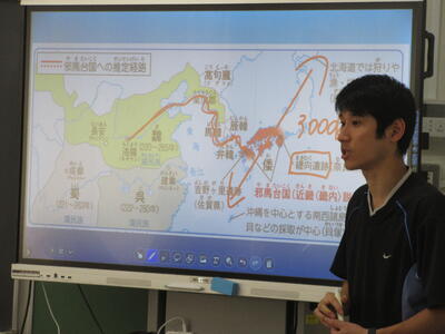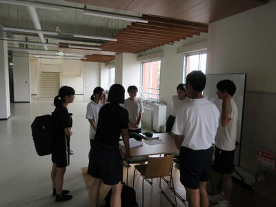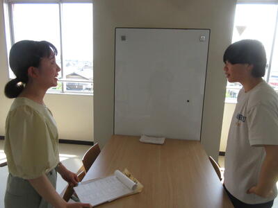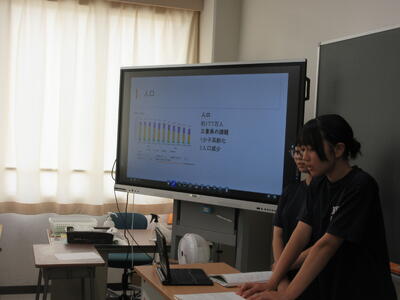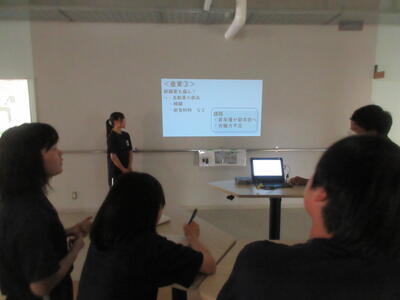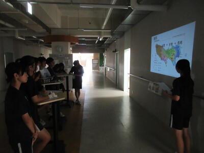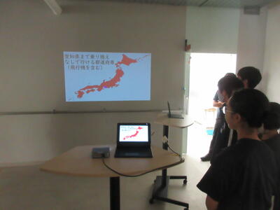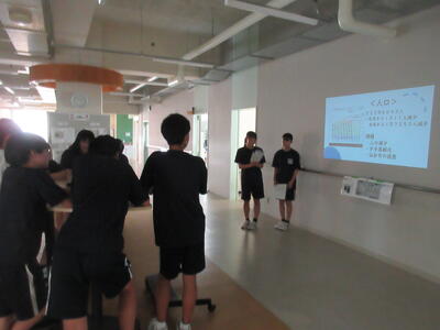 ▼C棟2階のコミュニケーションスペースでは、グループごとに都道府県の発表が行われています。他の人に伝えていくことで自分にとって貴重な勉強の機会になります。