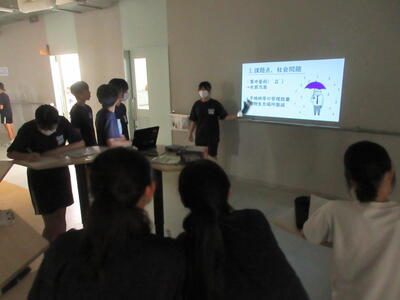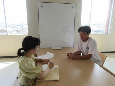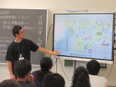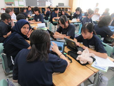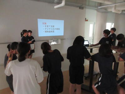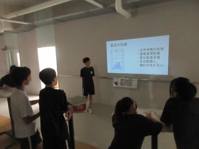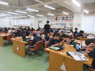 ▼C棟2階のコミュニケーションスペースでは、今日も2年生がグループごとに都道府県について調べたことを発表していました。調べた都道府県の特徴や課題をまとめ、自分の言葉で発表していきます。このコミュニケーションスペースは、まさに大切な学習の場になっています。