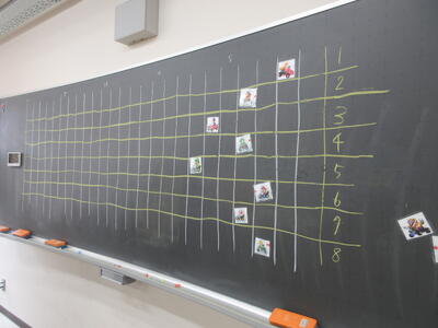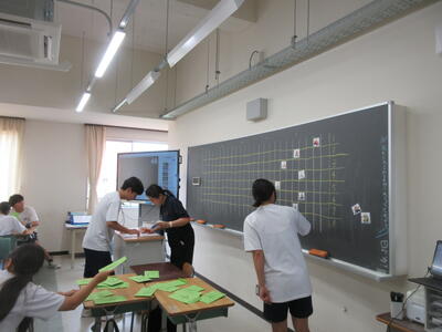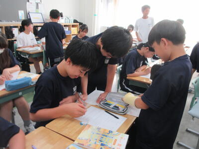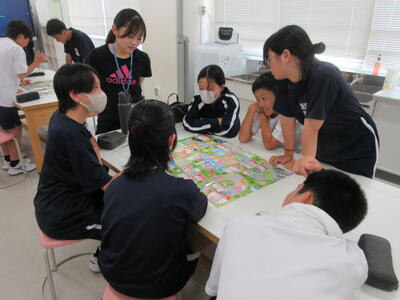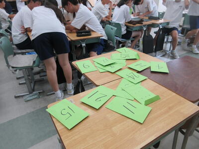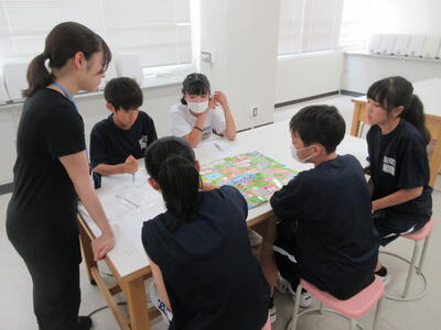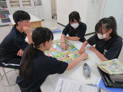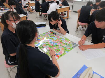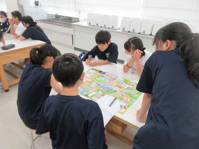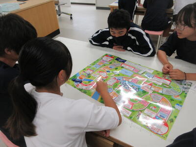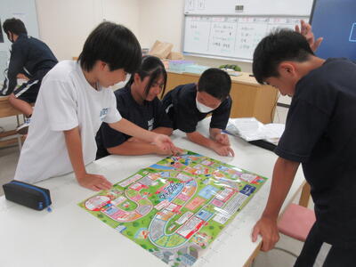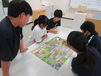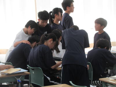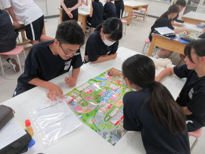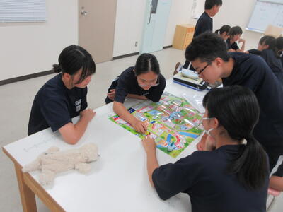 ▼3年生の英語の授業。グループで課題をクリアしながらゴールを目指していく活動が行われています。みんな、すごい勢いで話し合っています。
