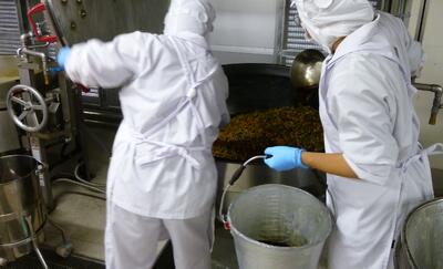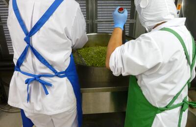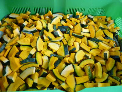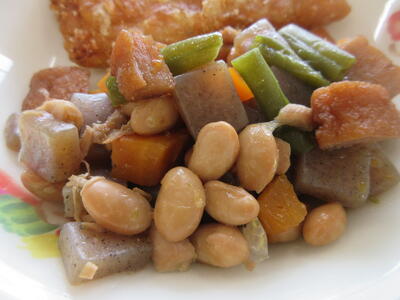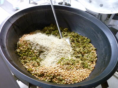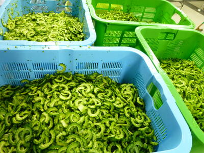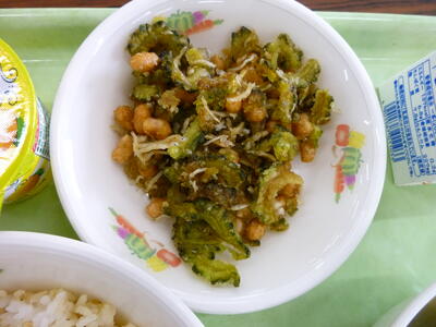 今日は「ゴーヤーとじゃこと大豆の揚げ煮」について紹介します。ゴーヤーは「苦瓜」の事で、古くから食べられていた沖縄の方言でゴーヤーと呼ばれています。ゴーヤーには、肌の調子を整えるのに欠かせないビタミンCと、身体の中の余分な塩分を追い出すカリウムが多く含まれています。また、独特の苦味が特徴ですが、この苦味は胃液の分泌を促して、食欲を増進する働きがあります笑うキラキラ今日は、2校分で52kg驚く・ビックリ!のゴーヤーにでんぷんをまぶしてから油でカラッと揚げ、大豆、ちりめんじゃこと一緒に、甘辛いタレをからめました3ツ星独特の食感と香りを味わいながら食べましょう。