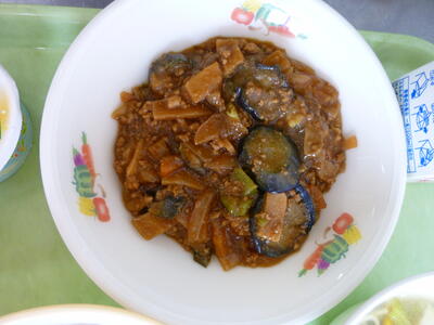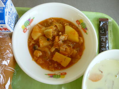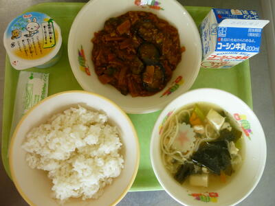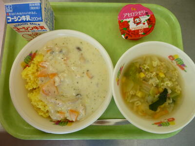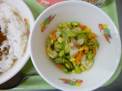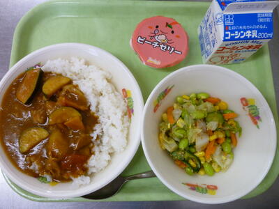 今日の給食は【夏野菜カレーライス、枝豆サラダ、ピーチゼリー、牛乳】です。
