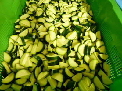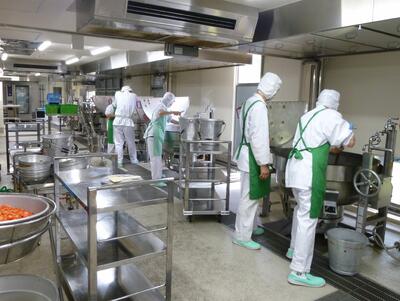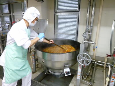 今日は「夏野菜カレーライス」について紹介します。今日のカレーには、夏が旬の野菜をたっぷりと使いました3ツ星定番の野菜の他、夏野菜のトマト、ズッキーニ、かぼちゃを入れました。トマトの赤い色には、紫外線によるダメージを予防や軽減する働きのある、リコピンという栄養素が含まれています。また、ズッキーニは、見た目はきゅうりに似ていますが、実はかぼちゃの仲間です笑うくせがなく、なめらかな舌触りが特徴です。色々な野菜の味や食感を味わいながら食べましょう。