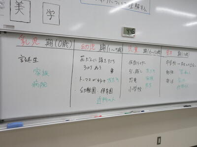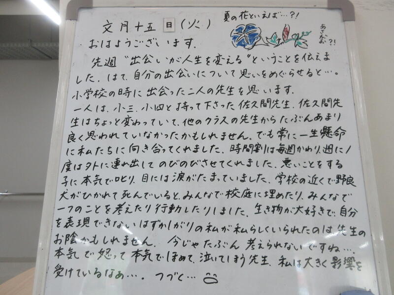 ▼C棟2階のホワイトボード。河崎先生から子ども達へのメッセージがぎっしり。河崎先生の先生としての原点が、小学校時代の担任の先生との出会いにあったことがわかります。