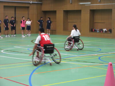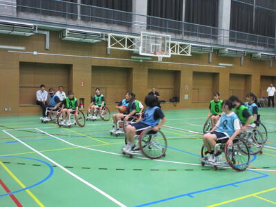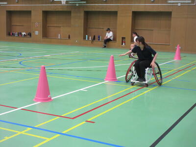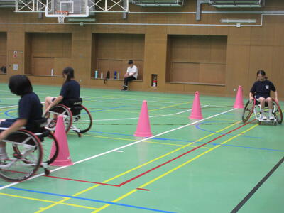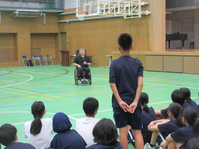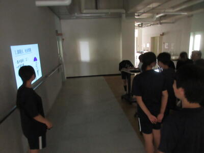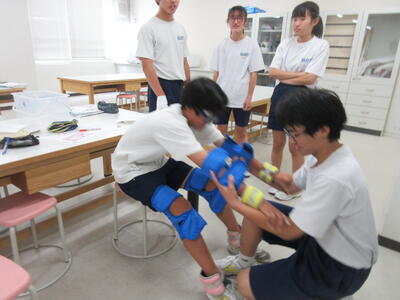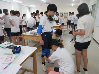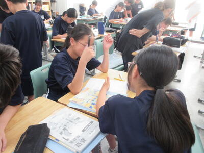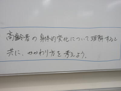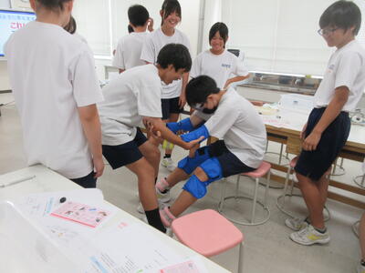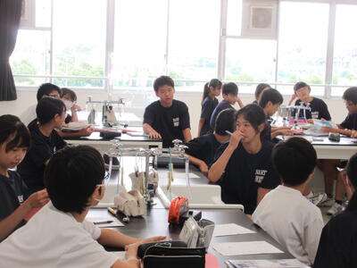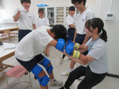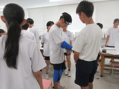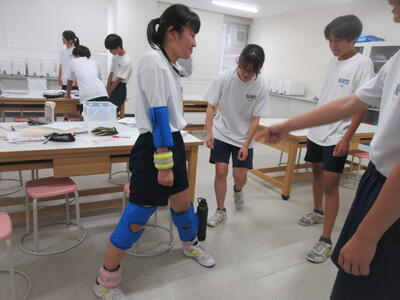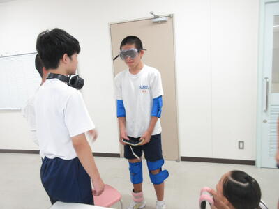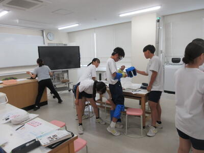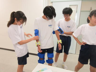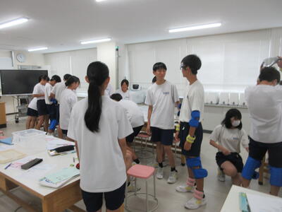 ▼被服室では3年生の家庭科の授業が行われています。「高齢者の身体的変化について理解すると共に、関わり方を考えよう」がテーマの授業。子ども達は高齢者の疑似体験を通して自らその大変さを実感していきます。また、周囲の子ども達もどう関わったら良いかを考える機会にもなっています。