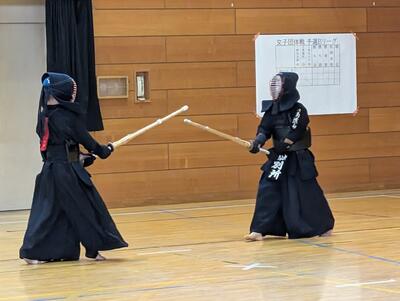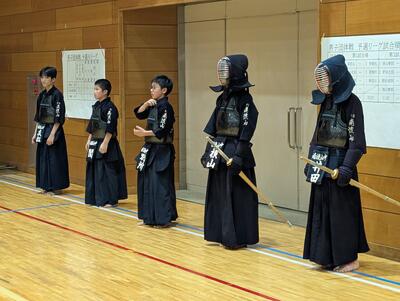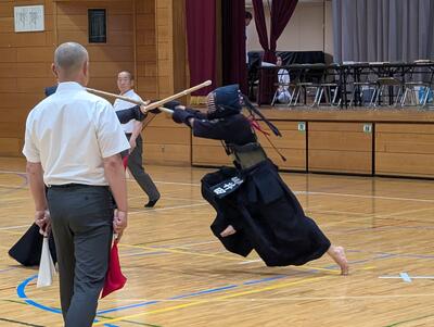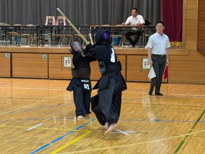 続いて、流山北部中と対戦!勝ち方次第では1位通過の可能性がある状況、チーム全員、気合いが入ります!まず、先鋒井田が鋭い技を二本決めて1勝目!次鋒横山は相手に技を決めさせず、引き分けに持ちこみます!中堅別所は、先に一本を取られますが、立て続けに二本決めて逆転勝利!副将関も合い面を制して一本勝ちすると、大将友松も見事に一本勝ち!4勝1分で勝利し、1位で予選リーグを通過します!