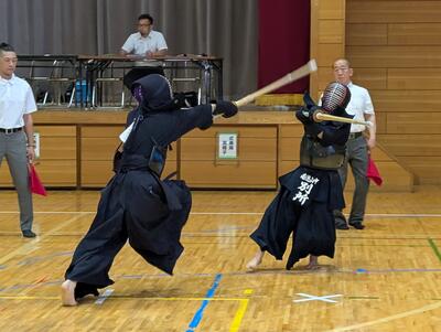 3チームのうち上位2チームが決勝トーナメントの切符を手にする予選リーグ、第1試合の相手は常盤松中です!チーム初戦、勝って勢いをつけたい先鋒井田、3分の戦いを互角に進めますが、惜しくも、終了間際に一本を取られてしまいます。続く次鋒横山は引き分け、中堅別所も互いに一本ずつ取り合い、引き分け。1敗2分、負けられない場面で副将関が勝負に臨みますが、先に相手に一本を取られてしまいます!しかし、ここから関が反撃!すぐさま面で一本を取り返すと、試合終了間際に再度面を決めて、二本勝ち!1勝1敗2分のイーブンに持ちこみます!大将友松は引き分けとなり、この試合、勝ち数・取得本数共に同点となります!