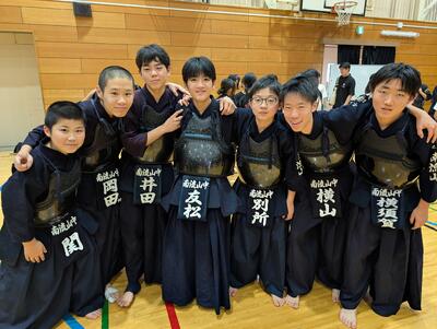 ベスト4に入ったAチームは、まず常盤松中との勝負に臨みました!先鋒岩渕、中堅山嵜、大将山田が勝利し、3勝2分で勝利!Bチームのリベンジを果たしました!2試合目の相手は、流山東部中!先鋒岩渕、次鋒横江が連勝!続く3人が相手に勝利を譲らず、2勝3分で2勝目!優勝に大手を掛けます!最終試合は野田南部中戦!中堅山嵜が勝利したものの、1勝1敗2分、本数差なし、まったくの互角のまま、大将戦へ!緊迫の試合が続く中、鍔迫り合いから相手が引き面を狙った瞬間、機先を制して山田が引き面を決め、一本!これによって、2勝1敗1分、南流中の勝利!大会全勝での優勝、県大会出場が決まりました!!