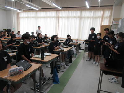 月曜日の朝を迎えた南流中、気持ちよく晴れた青空の下、清々しい週のスタートになっています!今週は、気温が急上昇!今日も日中は30℃を超える真夏日予想!週の半ばには35℃という予報も出ています!先週お知らせのとおり、今日から熱中症対策として体操服での登下校が可になっています!今朝は多くの生徒が体操服で登校してきました!ご家庭でも、十分な睡眠をとる、朝食を食べる、登校前に水分補給をする、など熱中症対策にご協力をお願いします!