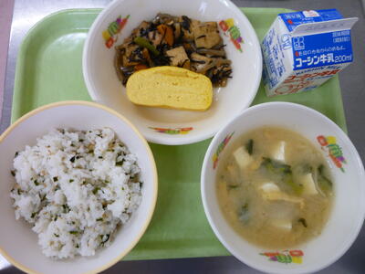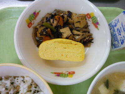 今日の給食は【わかめごはん、厚焼き卵、厚揚げとひじきの炒め煮、玉ねぎのみそ汁、牛乳】です。