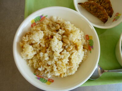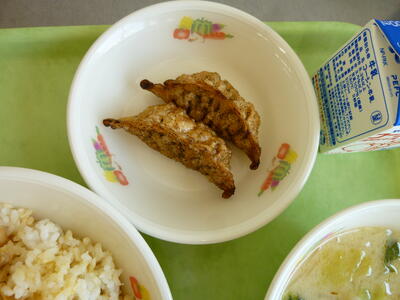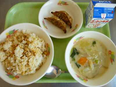 今日の給食は【豚肉と大豆の中華ライス、揚げぎょうざ、白湯スープ、牛乳】です。残さず食べましょう。
