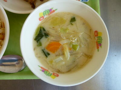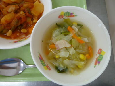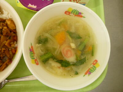 今日は真っ先に「根菜酢鶏」をいただきました。「豚肉」ではなくて「鶏肉」になると、どんな味になるのか楽しみでした。油で揚げた鶏肉と根菜が甘酢でさっぱりとしていて、どこかのCMのように、ご飯がとっても進みました。野菜の中華スープは、たくさんの色とりどりの野菜と春雨がたっぷり入った具沢山のスープで、とっても食べ応えがありました。今週も今日で終わりますが、栄養教諭の先生をはじめ、調理員の皆さん、毎日おいしい給食をありがとうございました!!