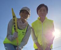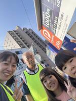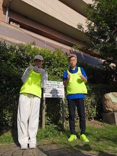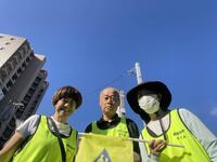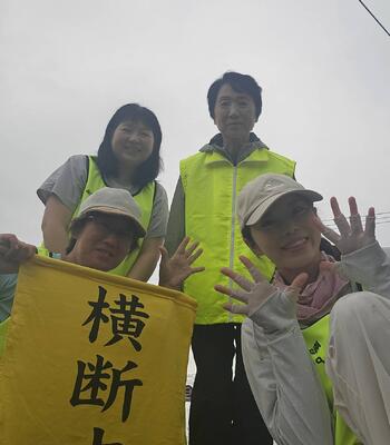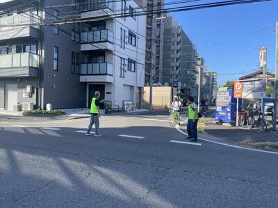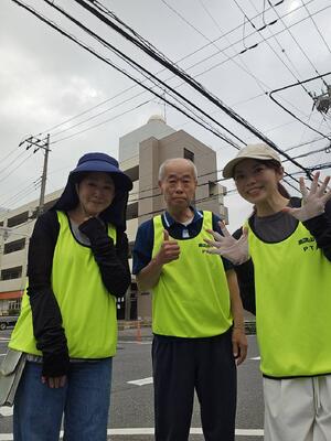 3連休明け、西松屋付近の交差点を見守ってくださる野村さんと広報担当の山口さん、そしてPTAの目黑会長。早朝から子ども達のために、本当にありがとうございます!!