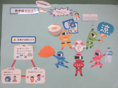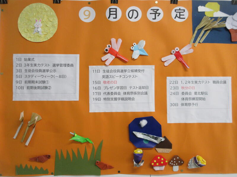▼A棟の掲示板には、ひまわり学級作成の可愛らしい「9月の予定」が、廊下を行き来する子ども達を温かく見守ります。
