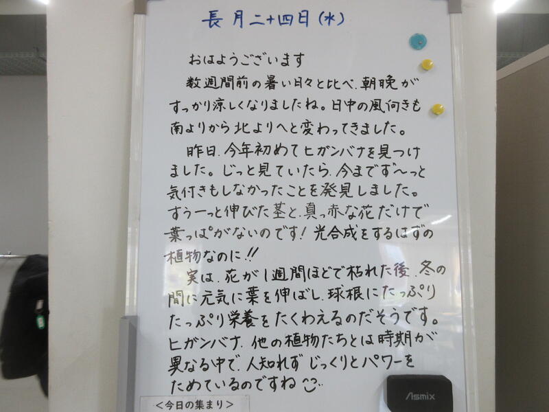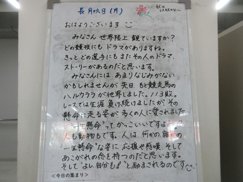 ▼C棟2階のホワイトボード。今日も河崎先生の温かい文字と言葉が子ども達の背中を押します。みんな、今日一日頑張ろうな!!