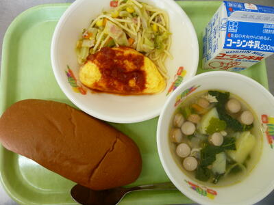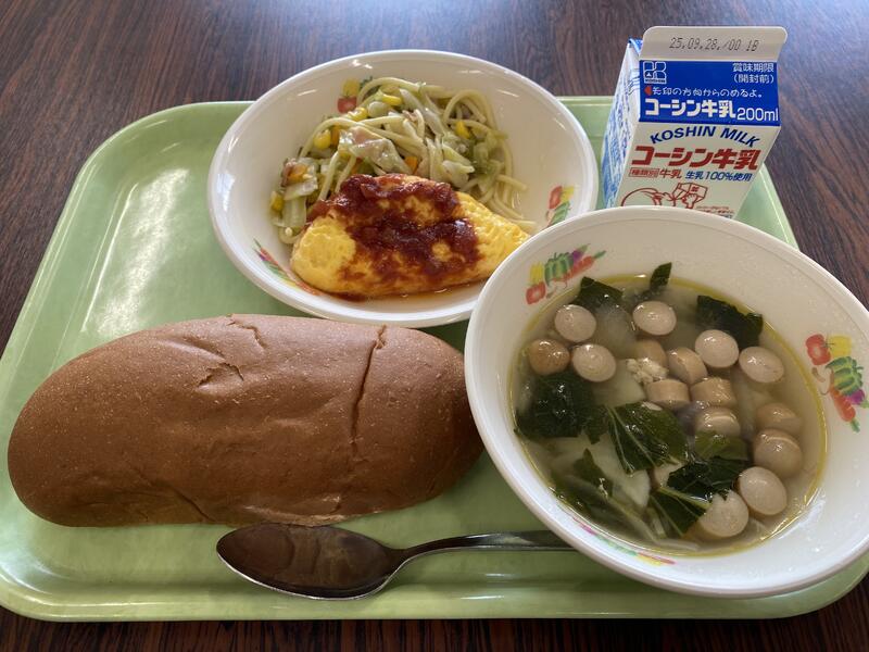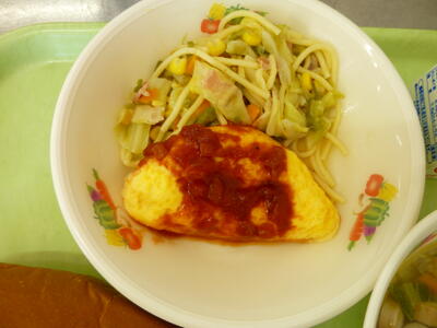 今日の給食は【黒糖パン、オムレツのトマトソースかけ、スパゲティソテー、ポテトスープ、牛乳】です。