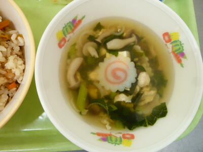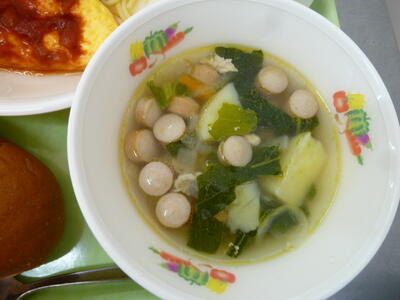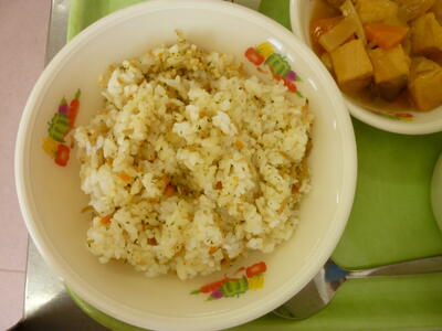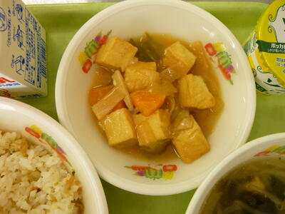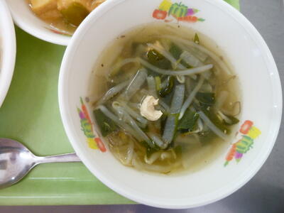 「青ねぎチャーハン」は、ねぎとにんにくの香ばしい香りで食欲が増しました。「わけねぎ」は、私の家でも市場に出荷していた野菜の一つで、よく出荷準備を手伝っていました。そんな懐かしい思い出と共に、最後まで残さずいただきました。次に「厚揚げ中華炒め」は、中華風の味付けで一口サイズの厚揚げが、ご飯に合いとても食べやすかったです。「春雨入り中華スープ」は、とにかく春雨がたっぷり入っていて、彩りも良く、食べ応えがありました。今日もおいしい給食を作ってくださった栄養教諭の先生、調理員の皆さん、ありがとうございました!!