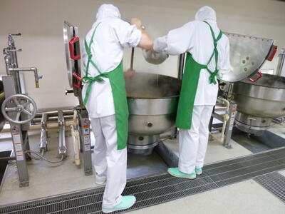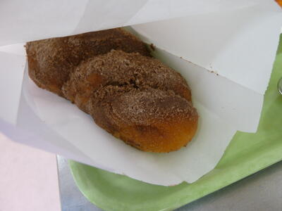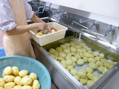 今日の揚げパンは、ココアと一緒にスキムミルクを加え、ミルクのコクがあり、おいしく仕上がっています。強い骨をつくるために欠かせない栄養素、カルシウムも入っているので、しっかりと食べましょう