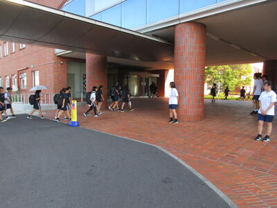 中庭に出て右手に進むと、A棟とB棟の間を通り、グラウンド内参観スペース、第1体育館横参観スペースに入れます。