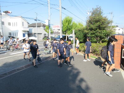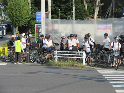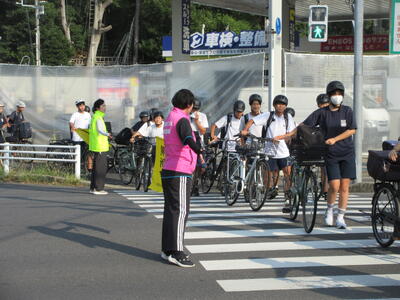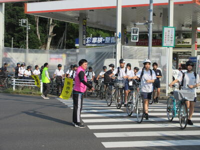 ▼今朝も厳しい暑さの南流中。 自転車通学者が集中する西門付近では、今日も三村さんと稲川さんが子ども達の見守り。子ども達からも元気な挨拶の声が聞こえてきます。温かい雰囲気の朝の始まりです。