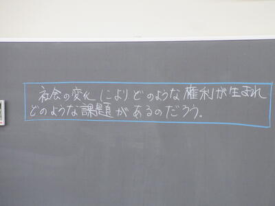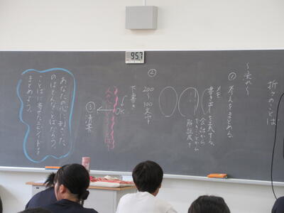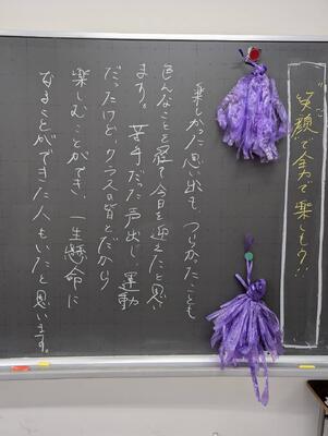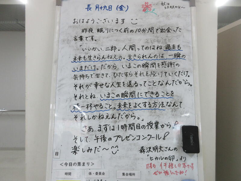 ▼C棟2階のホワイトボード。学年主任の渡邉久子先生からのメッセージが書かれています。「いまこの瞬間にできることを精一杯やること。未来をよくする方法なんてそれしかねぇんだから」。一人ひとりのそうした考えの延長線上に、平和な未来も、平和な世界もあると思います。