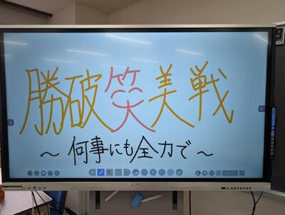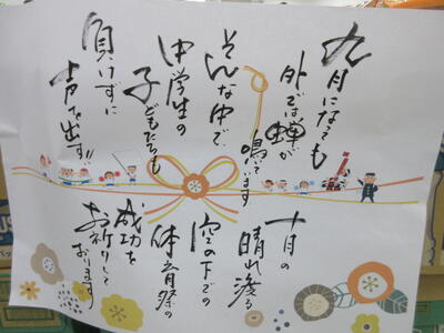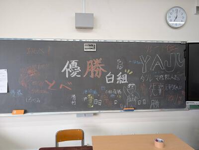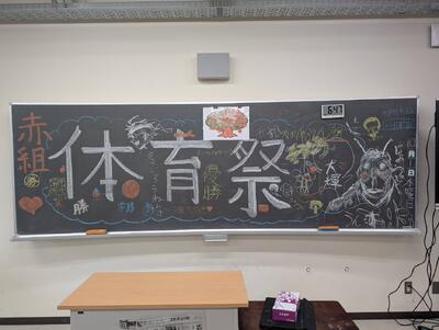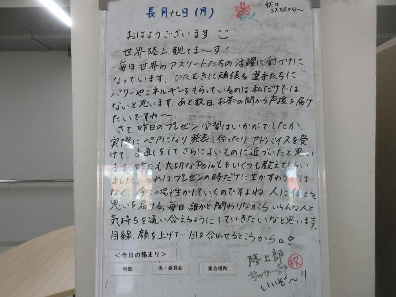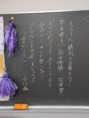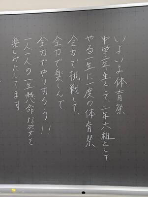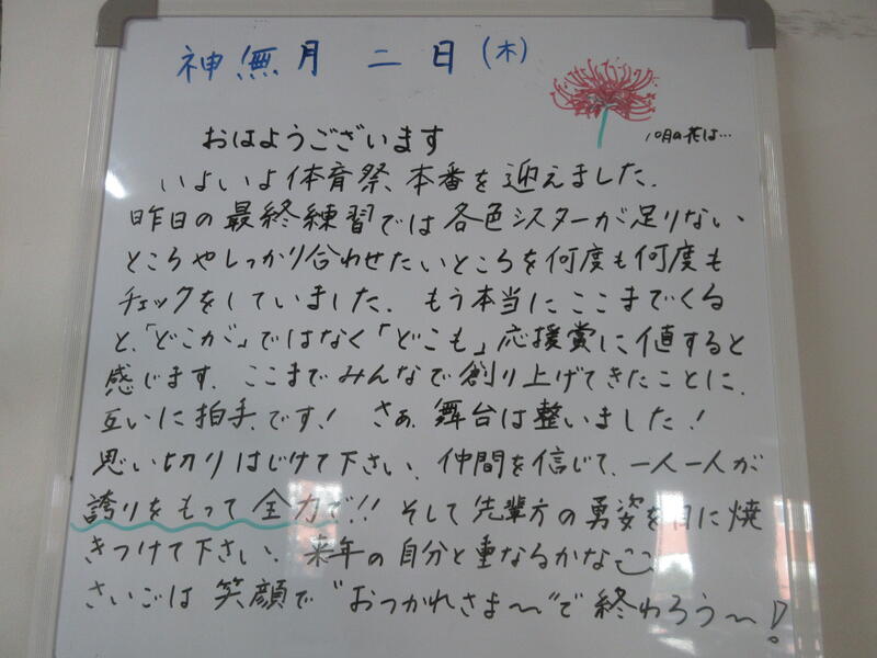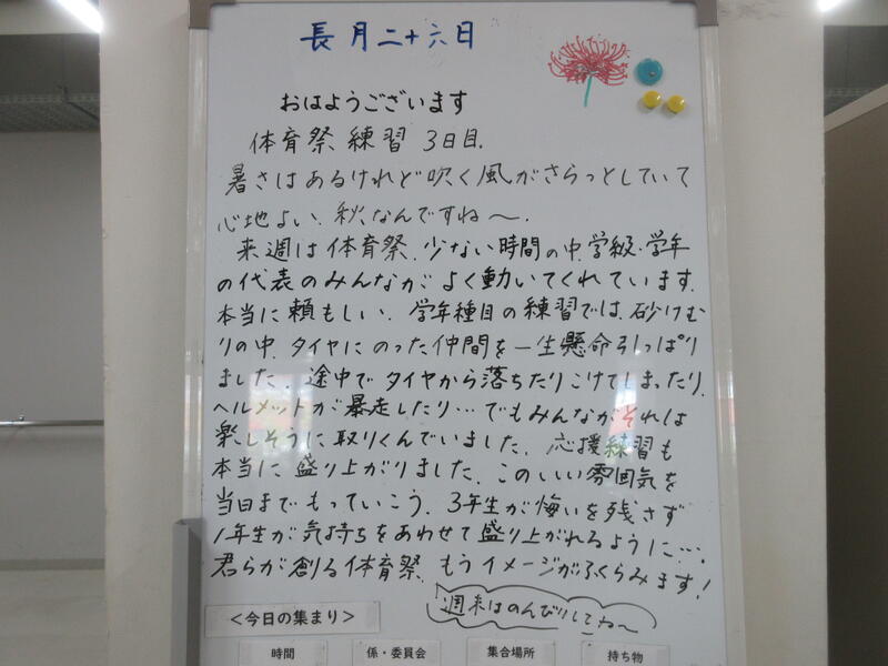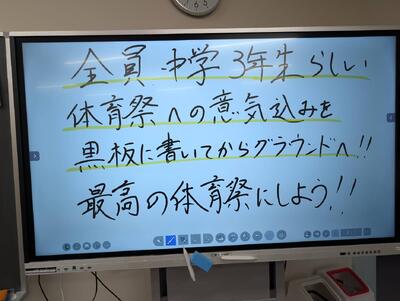 ▼C棟2階のホワイトボード。河崎先生の温かい言葉で、これまでの練習中のいろんな場面が頭をよぎりました。感動の体育祭に向けて今日一日も、南流中の子ども達は思い切り頑張ってくれるはずです。