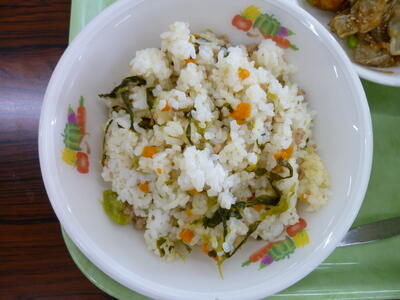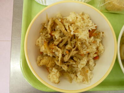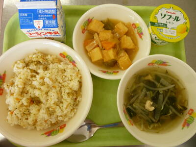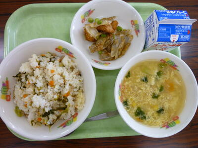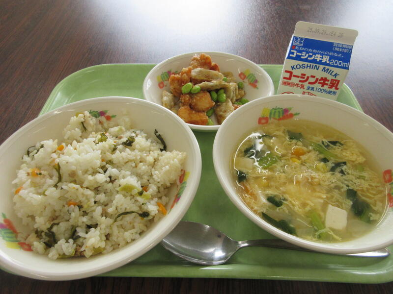 今日の給食は【高菜チャーハン、チキンチキンごぼう、中華卵コーンスープ、牛乳】です。