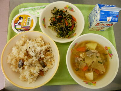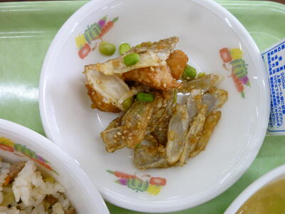 家ではあまり出せない給食の献立は、いつもワクワクしながらいただいています。今日はまず「高菜チャーハン」。高菜の味がご飯にしっかりしみていて、もりもり食べられました。そして、栄養教諭の先生が自信をもっておすすめの「チキンチキンごぼう」。甘辛いタレが効いたごぼうと鶏肉は、絶妙な組み合わせで高菜ご飯がますます進みました。ネーミングですが、「チキチキ〇ーン」と勘違いしていた1年生がいたようです。確かに似ていますね。なかなかかわいい名前で、次に登場するのが楽しみです。最後に具がたっぷり入った「中華卵コーンスープ」は、かき卵がふわっとした食感で、飲み終わってほっとするスープでした。今日も、栄養教諭の先生をはじめ、調理員の皆さん、最高の給食を作っていただき、ありがとうございました!!