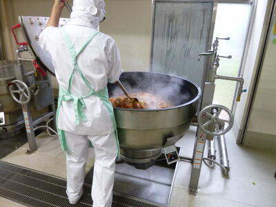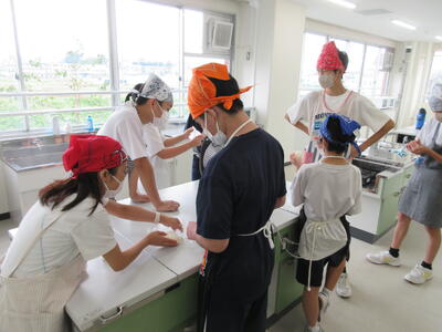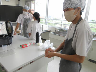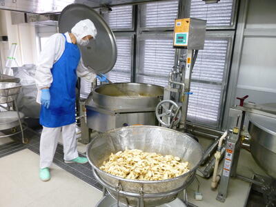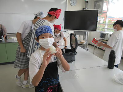 ▼4校時の調理室は、玉ねぎの甘い良い香りが立ちこめます。ひまわり学級の子ども達が、家庭科の授業で調理実習に取り組んでいました。