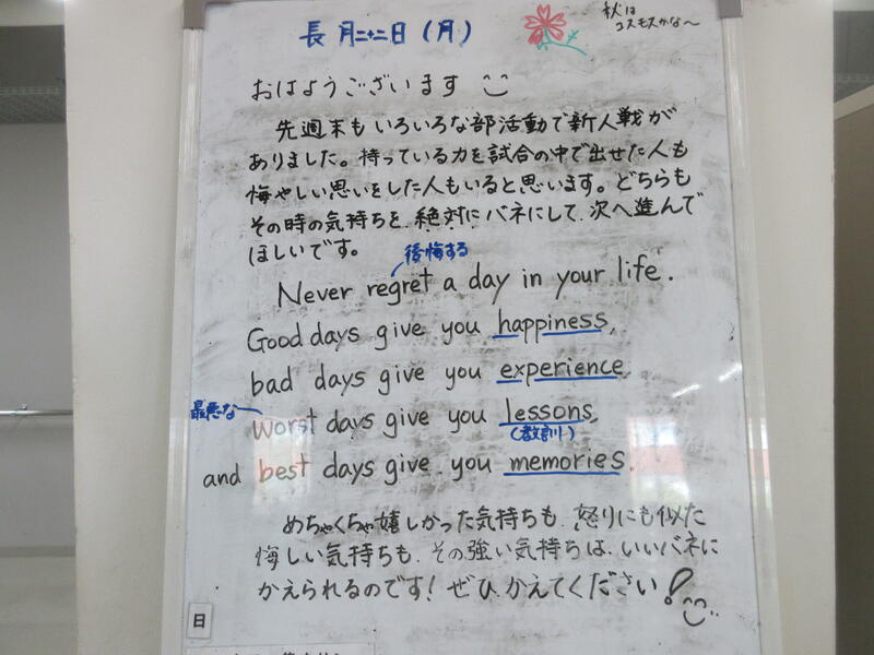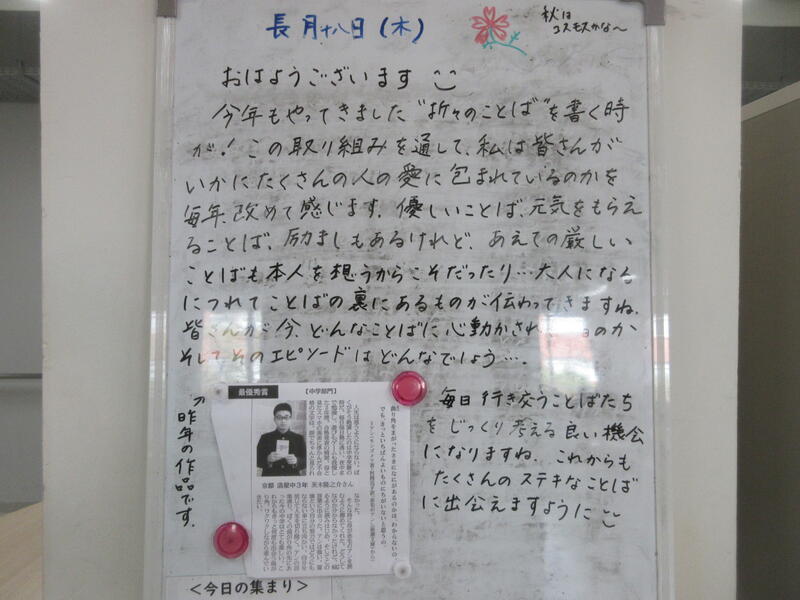 ▼C棟2階のホワイトボード。2学年主任の渡邉久子先生からのメッセージ。「一生懸命」や「まじめ」が評価される世の中でなくてはいけないと思います。それに、その姿勢さえ持っていれば、明確な成果には表れなくとも、必ずどこかでプラスになり、最終的には善い結果が導き出されるのです。