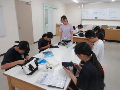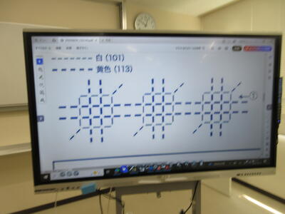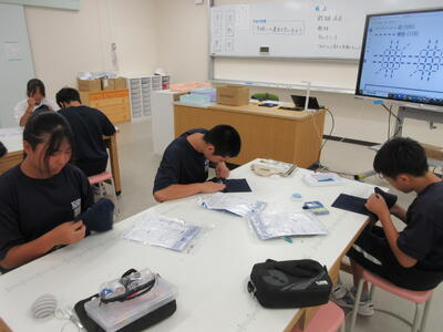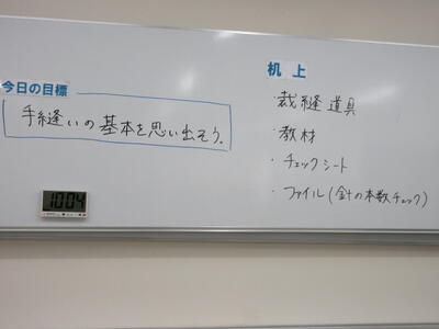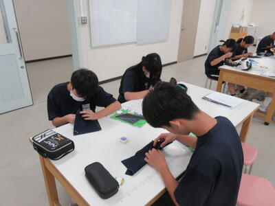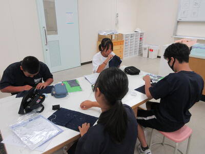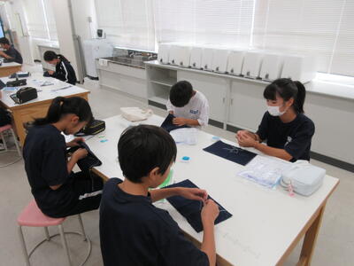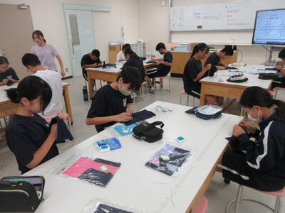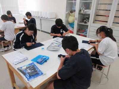 ▼D棟2階の被服室。「手縫いの基本を思い出そう」をテーマに、1年生の子ども達が一心不乱に手縫いに取り組んでいます。