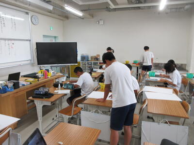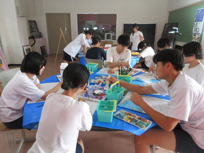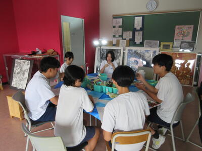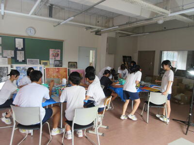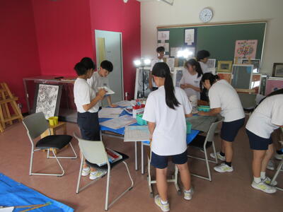 ▼F棟2階の美術室。3年生の作品作りが続いています。子ども達一人ひとりの個性あふれる作品が仕上がりつつあります。