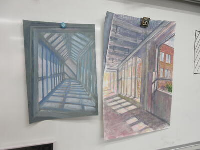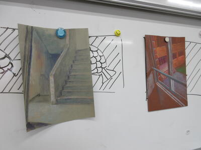 ▼美術室のホワイトボードには、様々なお店にご自分の絵を寄贈されている美術界の巨匠、石原重人先生のお手本となる作品が貼られています。さすがとしかいいようがありません。