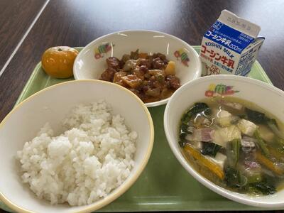 今日の給食は【ごはん、根菜酢鶏、野菜の中華スープ、冷凍みかん、牛乳】です。