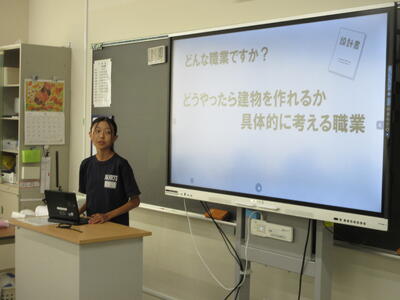 「職業インタビュー」をテーマにプレゼンに挑戦している1年生。夏休みに身近な大人にインタビューをしてわかった、職業の特徴や働く上で求められる力などを、パワーポイントで作成したスライドを提示しながらプレゼンします!アルバ・エデュの先生方からは、「調べたことの報告だけでなく、自分はそこから何を得たのかなどを伝える『自分が主役』のプレゼンになっているか」「文字ばかりのスライドになっていないか」「スライドのアニメーションは本当に必要なものか」など、プレゼンの改善点を教えていただきました!一人ひとり、集中してプレゼンの改善に取り組み、仲間とプレゼンし合うことで、その成果を確かめていきました!1年生、すごい集中力と吸収力でした!!