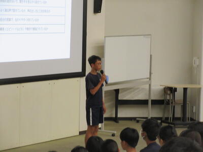 ▼生徒会長の話。体育祭スローガン「南流魂~誇りをもって全力で~」と全員で声をそろえます。子ども達の気迫あふれる声が響き渡ります。