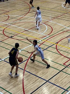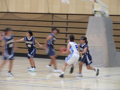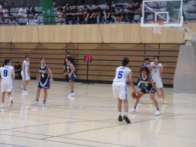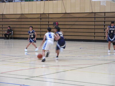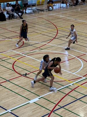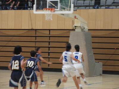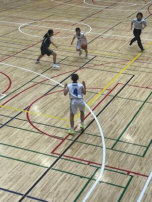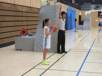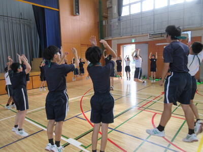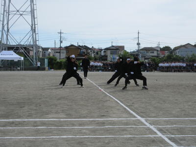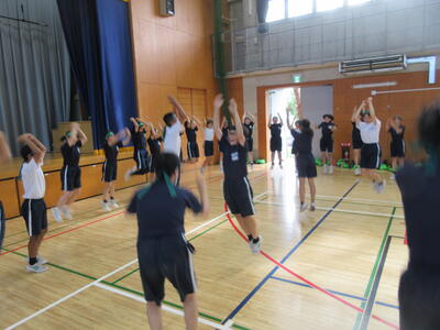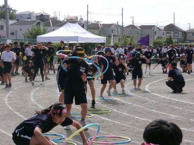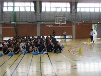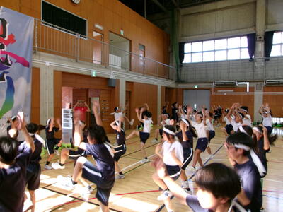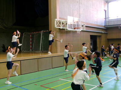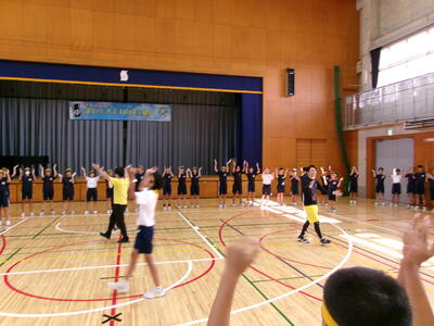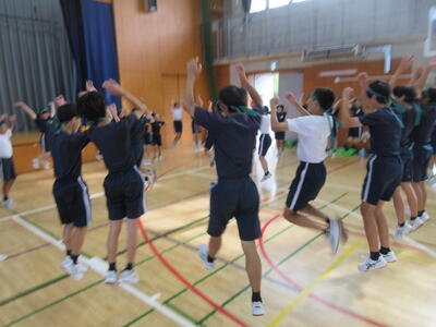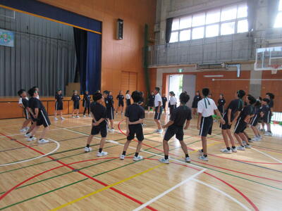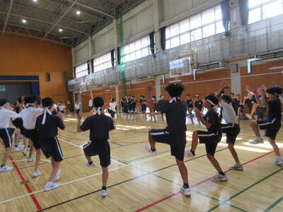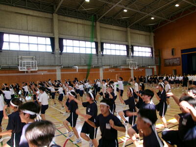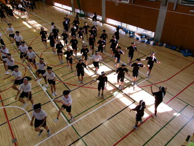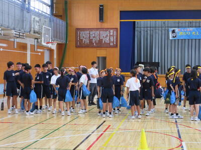 ▼第1体育館では1年生半分のクラスの学年種目の練習。この種目の練習にしてはスペースが狭いのですが、それでも大切な細かい調整が行われています。竹の棒を飛び越える動作も、実は勝敗のカギを握るはずです。