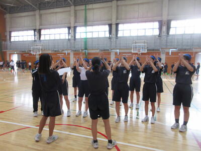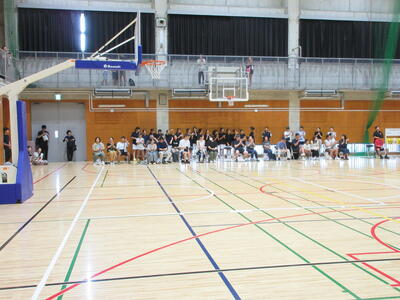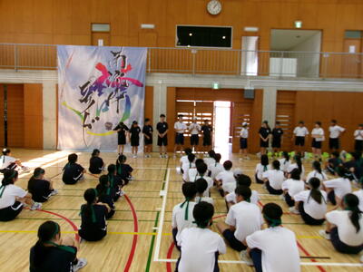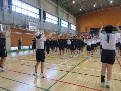 ▼最高の体育祭を創るべく、紫組と赤組が敵とは言え、合同で円陣を組み全員で校歌を歌い上げます。第2体育館中にものすごい声が響き渡ります。
