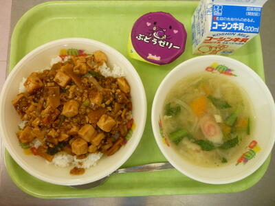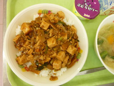 今日の給食は【青ねぎチャーハン、厚揚げの中華炒め、春雨入り中華スープ、サイダー風ゼリー、牛乳】です。