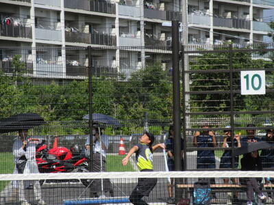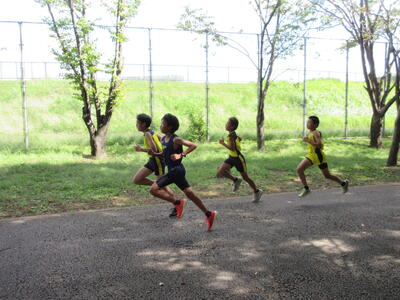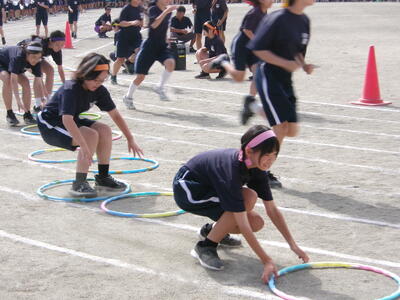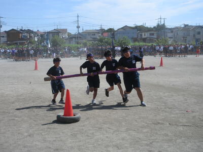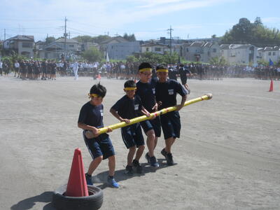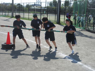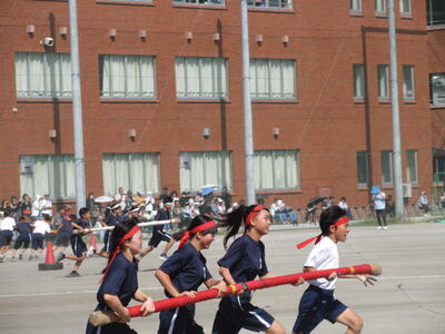 竹の棒を持った4人組でコーンを回って繋いでいくおなじみの種目ですが、特に大変なのは両サイドの子ども達。自分が中心で回るときはしっかりとコーンの内側でメンバーを支え、自分が一番外側の時は遠心力に負けずに素速く回らなければなりません。最後は竹の棒を二人で保持して、グループの足の下と頭の上をできるだけ素速く通して、次に繋ぐ必要があります。
