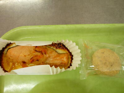 今日の給食は、全体の見た目がとてもカラフルで気分上々!!どれも食欲をそそるメニューでした。やっぱり見た目は大事ですね。まず、存在感の大きな黒糖パンからいただきました。ほのかな甘みのあるパンは、牛乳と合わせてぴったりでした。オムレツのトマトソースかけは、酸味の効いたソースに甘めのオムレツで、とてもおいしくいただきました。スパゲティソテーは、塩味ベースでたくさん食べたくなるような、さっぱりとしたソテーでした。ポテトスープはコンソメが効いた透明のスープに、大きめのじゃがいもを中心に野菜とウインナーが入り、食べ応え十分のスープでした。今日もおいしい給食を作ってくださった栄養教諭の先生、調理員の皆さん、ありがとうございました。