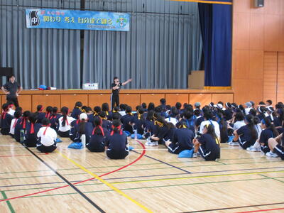 ▲子ども達にとって真に実りのある2時間!! ホール内は子ども達の活気で満ちあふれていました!! 素晴らしい機会をいただいた三浦さん、蝦さん、そして、本校の子ども達の取材に来てくださった澤田さん、本日はありがとうございました!!