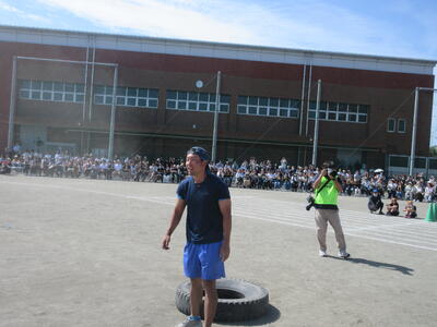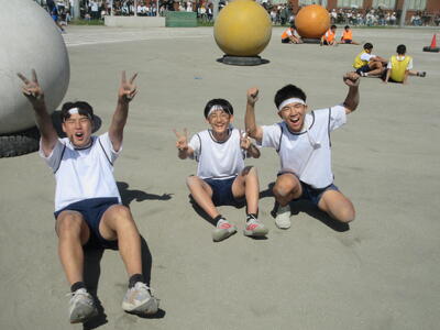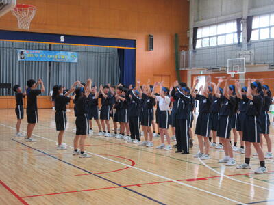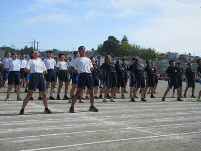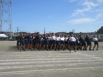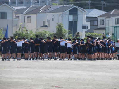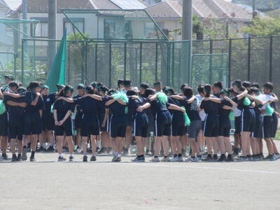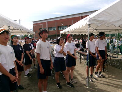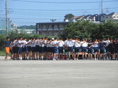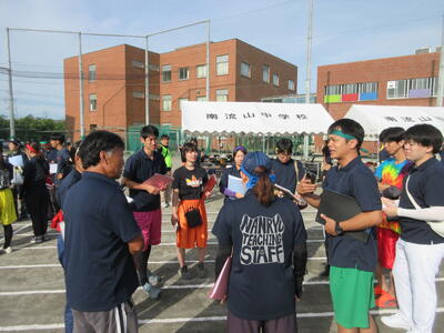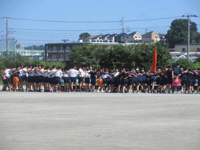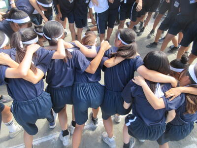 この地での移転2年目、「第43回体育祭」の開会式に先立って先生方の最終打合せ。そして円陣を組んで体育祭の成功を誓い、全員で雄叫びを上げます。頑張る生徒に負けないように先生方も気合いを入れます。