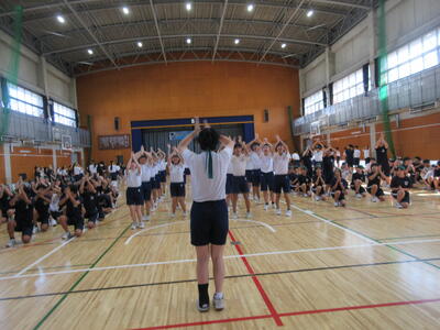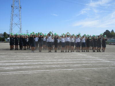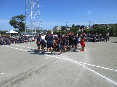 ▼3年生は学年練習の後、先生方も加わり総決起集会!! 朝礼台の前は大変な盛り上がりです!!