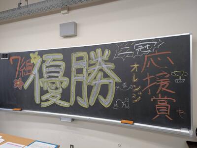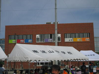 ▼予行の日に行われた「長縄」の結果発表。1位ー白、2位ー紫、3位ー緑、4位ー橙、5位ー青、6位ー黄、7位ー赤と発表され、それぞれの色の得点掲示板に点数が示されました。しかし、勝負はまだ始まったばかり。みんな、頑張れ!!