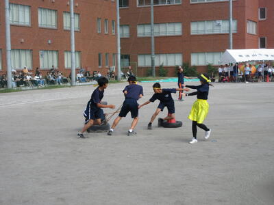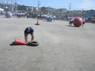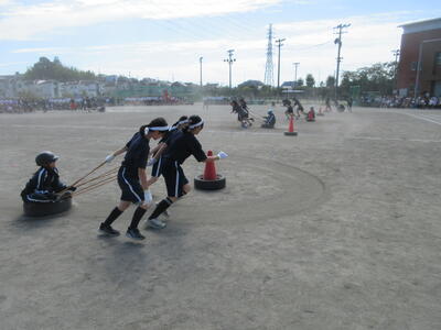 学年種目のトップバッターは2年生。その名も「タイヤ引き~嵐を呼ぶGO!GO!カート~」。タイヤの上に乗った子を落とさないように、3人で引っ張ってリレーを行うという力勝負の、大迫力の戦いが繰り広げられます。
