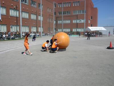 学年種目のトリを務めるのはもちろん3年生。競技としては「大玉転がし」なのですが、その名も「転がすだけじゃダメですか♥?」。始まる前から3年生の子ども達はもうノリノリです!!