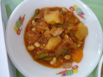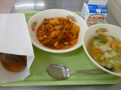 今日の給食は【ココアミルク揚げパン、鶏肉とじゃがいものトマト煮、野菜スープ、牛乳】です。
