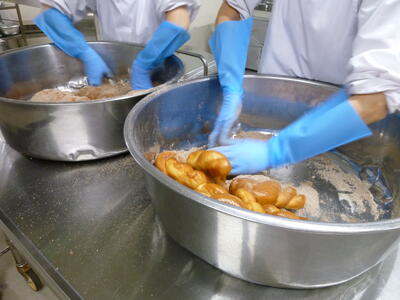 そんなチキンチキンごぼうは、その名の通り、鶏肉、ごぼう、それぞれにでんぷんをつけて油で揚げ、砂糖やしょうゆの甘辛いタレを合わせて作ります。仕上げに枝豆を散らして完成です